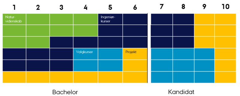 Civilingeniøruddannelsernes bachelorforløb er bygget op efter en ensartet kursusstruktur, der sikrer, at du opnår relevante teoretiske kernekompetencer med eksempler på anvendelse undervejs, inden du specialiserer dig på kandidatdelen. Her kan du se et eksempel på studiets opbygning i semestre.